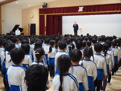 19日の終業式ではホールに全学年が集まり、終業式を行いました。終業式では園長先生のお話を聞き、2学期を振り返ったり、冬休みの約束を聞いたり、園歌をみんなで歌いました。話を聞く姿勢が素敵で、1学期からの成長がさらに感じられました☆