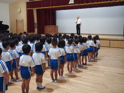 7月18日に1学期の終業式を行いました。ホールに集合して、園歌を歌ったり、園長先生のお話を聞いたりしました。
