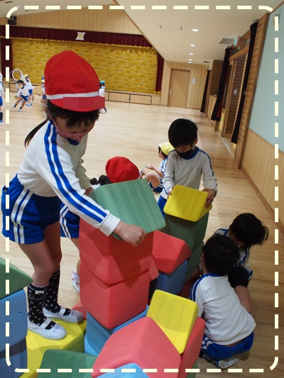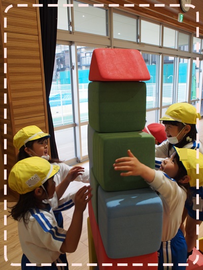 みんなで山を作ったり、バルーンの中に入ってコップを作ったり、力を合わせていろんな形を作れるようになってきました。