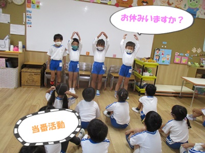 また、始業式ではホールにみんなで集まり、元気に挨拶をしたあと、園長先生のお話を聞きました。2学期は、運動会に秋の遠足、子どもフェスティバルと楽しい行事も盛りだくさん♪